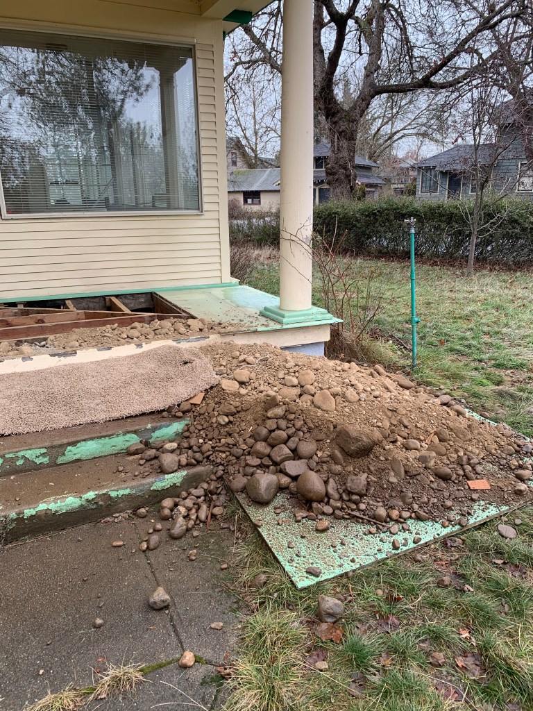 I don’t envy his job. Moving rocks and dirt out from under an old house, that’s sinking, by hand, is not for the faint of heart. But he made incredible progress. When I arrived today, he had almost made it to the goal!